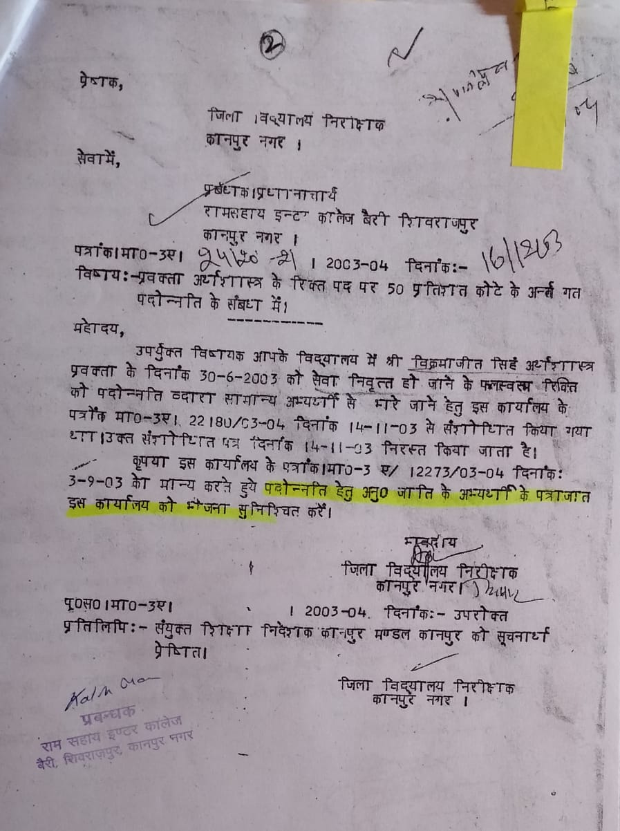 मालूम हो कि पत्रांक सं0: 26/2015-16 दिनांक 18.11.2015 के द्वारा तत्कालीन प्रधानाचार्य द्वारा पदोन्नति में अनुसूचित जाति के आरक्षण का लाभ प्राप्त सोहन लाल प्रवक्ता (अर्थशास्त्र) को स्नातक वेतन क्रम में पदावनत किए जाने की सूचना देते हुए स्नातक वेतन क्रम में वेतन निर्धारण करने के लिए सम्बन्धित की सेवा पुस्तिका जिला विद्यालय निरीक्षक, कानपुर नगर को भेजी गई थी। 18 नवंबर 2015 को पदावनत किए जाने के बावजूद वर्ष 2016 में सातवेंबि वेतन आयोग के अनुसार उल्लिखित वेतन निर्धारण प्रपत्र पदनाम में कूटरचित ढंग से हेराफेरी करके तैयार किया गया। जिसमें तत्कालीन प्रधानाचार्य के हस्ताक्षर तो हैं लेकिन और नियमानुसार प्रबंधक के हस्ताक्षर कराए बिना ही प्रवक्ता पद का वेतन निर्धारण कर दिया गया। वर्ष 2021 में भी तत्कालीन प्रधानाचार्य ने प्रवक्ता से स्नातक वेतन क्रम में वेतन निर्धारण करने के लिए जिला विद्यालय निरीक्षक कार्यालय को पत्र भेजा। लेकिन जिला विद्यालय निरीक्षक/ लेखाधिकारी कार्या0 जि0वि0नि0 कानपुर नगर स्तर पर किन कारणों से सोहन लाल का वेतनमान स्नातक क्रम में निर्धारित न करके लंबित रखा गया। जबकि सर्विस बुक में भी पदावनति का अंकन किया जा चुका है। यह प्रकरण भी अत्यन्त गंभीर है और विभागीय जांच का विषय है। जांच होने पर कई प्रकार की वित्तीय अनियमितताएं प्रकाश में आ सकती हैं।