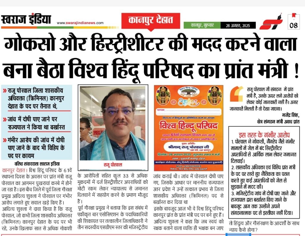 कानपुर। विश्व हिंदू परिषद के प्रांत मंत्री राजू पोरवाल एक बार फिर विवादों में हैं। हाल ही में स्वराज इंडिया अखबार ने अपनी रिपोर्ट में राजू पोरवाल पर गंभीर आरोप प्रकाशित किए थे, जिनमें कहा गया था कि वह कानपुर देहात जिले में गो-तस्करों और हिस्ट्रीशीटरों की मदद करने वालों में शामिल रहे हैं। खबर छपने के बाद अब राजू पोरवाल की ओर से अखबार को लीगल नोटिस भेजा गया है। यह कदम खुद उनके खिलाफ उठे सवालों को दबाने और मीडिया पर दबाव बनाने की कोशिश माना जा रहा है।