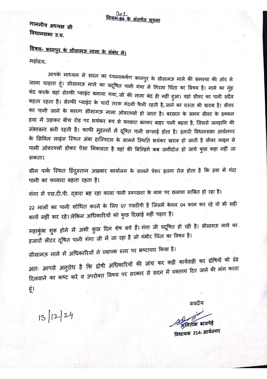 –सपा विधायक अमिताभ बाजपेई ने सीसामउ नाला के गंगा नदी में गिरने सहित कई मुददों पर योगी सरकार को घेरा